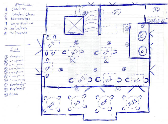 Plano original, bosquejo del "Proyecto Cafe del Octavo". El presente croquis realizado a mano alzada, establece el plan de obra y la ubicacion exacta de cada uno de los muebles y utencillos a colocar. El acceso por escalera y por ascensor, desemboca en un salon comedor en donde se distribuyen 7 mesas de las cuales seis de ellas para dos personas y una para cuatro, teniendo una capacidad en el salon de 16 personas sentadas. En la parte de la terraza, la programacion indica 4 mesas redondas plasticas para cuatro personas cada una, haciendo un total de 16 personas sentadas en terraza. La suma de todas las mesas, hace un total de 32 personas sentadas dentro y fuera del salon. Cuando se inauguro, se coloco una mesa extra al lado de la (M1) llegando asi a una totalidad de 34 personas sentadas. |