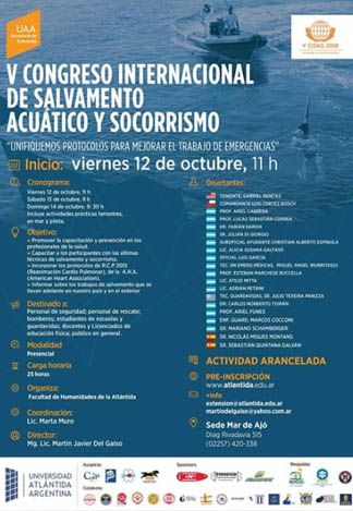 ARGENPAX Hoteleria aloja a los participantes y disertantes en Mar de Ajo de CISAS, (Congreso Internacional de Salvataje Acuatico y Socorrismo). Dicho evento que se realiza en la mencionada ciudad anualmente, porne a la localidad en el foco de los preparativos durante 3 dias, dado a que especialistas de Argentina, Chile, Estados Unidos y España, capacitan a los participantes que acuden a Mar de Ajo, de todas partes del pais y aun asi, de la vecina nacion de Uruguay. El congreso se divide en 4 etapas, la parte teorica, el salvamento en playa, el rescate acuatico en un natatorio (utilizandose las instalaciones del Club Social y Deportivo Mar |