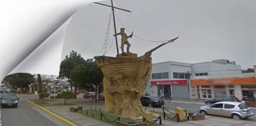 Siguiendo por la Av. Libertador llegamos el centro neuralgico de la ciudad, la interseccion de la Av. Libertador con Francisco de las Carreras o San Juan, como se rebautiza al cruzar la arterea principal. Alli, San Martin en un barco, es el monumento caracteristico de Mar de Ajo y el primero en su homenaje, ya que San Martin siempre luce a caballo. |