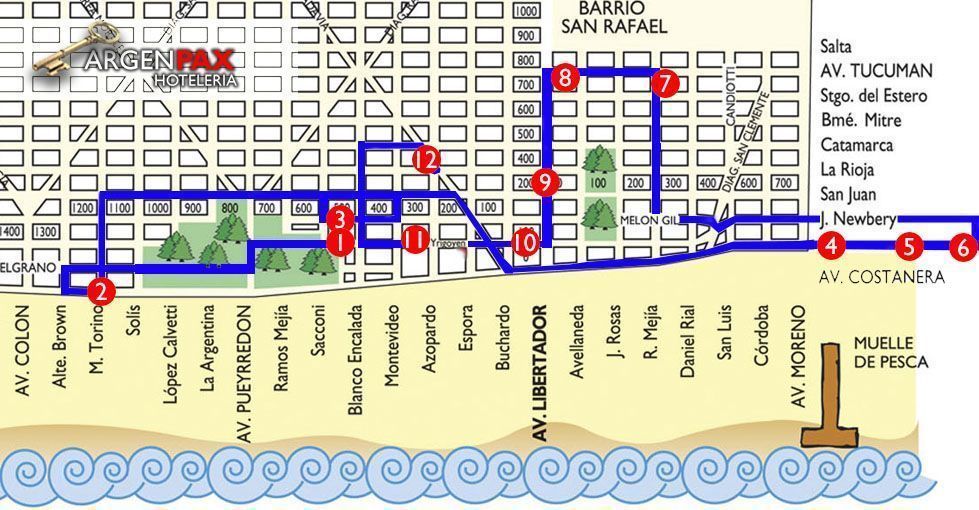 Siguiendo por el centro, el punto 10, es el recorrido por la Peatonal de Mar de Ajo, la calle Hipolito Yrigoyen y la recorremos en todo su trayecto centrico, desde Libertador hasta Azopardo que es semi peatonal y luego hasta Blanco Encalada donde giramos para el fin del recorrido. Por su trayecto vemos pizzerias tradicionales al igual que la casa de alfajores emblema de la zona e innumerables tiendas tanto de ropa como de diferentes ramas. |