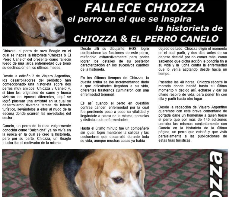 El fallecimiento de Chiozza, se origino en pleno auge de la historieta. Si bien los "Perros" no se conocieron porque vivieron en epocas distintas, la saga los une y los recrea como grandes amigos, pero la realidad, es que en la cronologia, Chiozza aun estaba en vida cuando las ediciones salian al mercado. El 18 de Abril de 2014, el periodico Viajero Argentino quien albergo las tiras de Chiozza & el Perro Canelo, anuncia el fallecimiento del mismo. Paradojamente, 4 ediciones posteriores, moririan las tiras, ya que el diario, anuncio el cierre de la saga, como si el destino hubierse estado marcado, en pleno auge, la muerte de Chiozza golpea indirectamente a la saga que termina interrumpiendo las ediciones. Chiozza un perro vestido de playa, representando a la costa Argentina, mientras que su amigo Canelo, vestido de tiroles como aleman de Villa General Belgrano y la Sierra. |