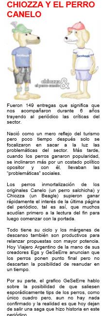 Chiozza & el Perro Canelo, fue una tira de comics turistica, desarrollada entre 2008 y 2014, por el gionista GeSeErre y el grafico EGS, dando desarrollo a dos perros que viajaban por el pais, comentando la problematica del turismo. Todo consistia en cuatro cuadros de comics donde se desarroban cada quince dias una nueva historia, una nueva problematica. Chiozza y el Perro Canelo, o mas conocido como "Los Perros", fue creado para decir con total libertad todo aquello que se esta haciendo de manera negligente en el sector. |