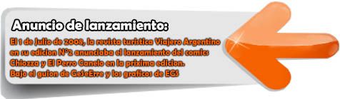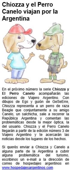 Chiozza & el Perro Canelo, fue una tira de comics turistica, desarrollada entre 2008 y 2014, por el gionista GeSeErre y el grafico EGS, dando desarrollo a dos perros que viajaban por el pais, comentando la problematica del turismo. Todo consistia en cuatro cuadros de comics donde se desarroban cada quince dias una nueva historia, una nueva problematica. Chiozza y el Perro Canelo, o mas conocido como "Los Perros", fue creado para decir con total libertad todo aquello que se esta haciendo de manera negligente en el sector. |